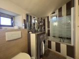 Nous retrouvons au rez-de-chaussée : une pièce de vie avec cuisine, une salle de bain ainsi qu'un WC. À l'étage : deux chambres.