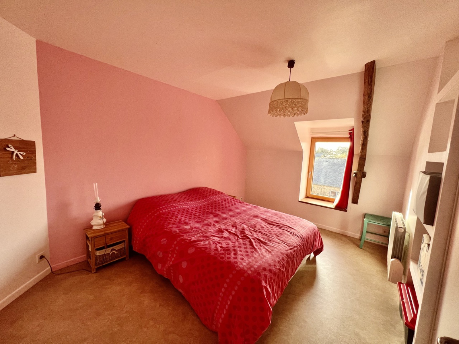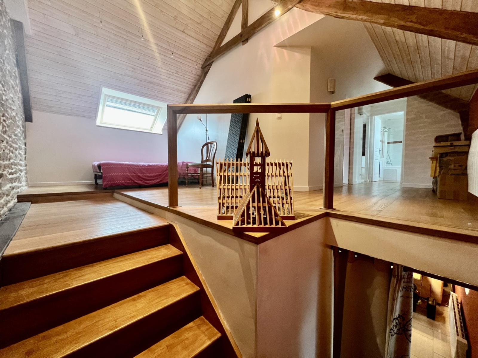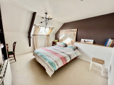 À l'étage : vous retrouverez deux chambres avec de beaux volumes, une mezzanine pouvant créer une autre chambre et une salle de bains avec WC.